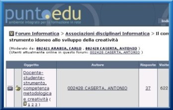 Moderatore PuntoEdu /MIUR 2002/03 (Forum, risorse e aree di collaborazione in rete per la formazione degli insegnanti delle scuole impegnate nella sperimentazione della riforma: "Il computer strumento idoneo allo sviluppo della creatività"). 2002/03